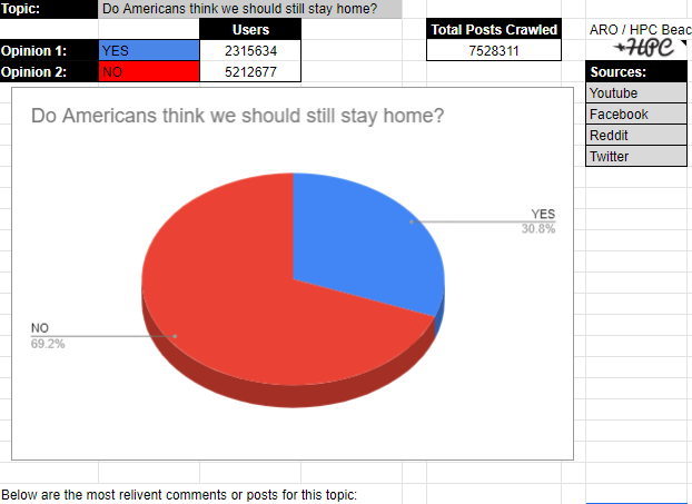How true is the narrative? The ARO ran its bots to analyze user comments, posts, videos, and other online expressions. This information is used to gather actual online user sentiment from social media applications. This user sentiment helps our program determine if Americans still think we should all stay home.