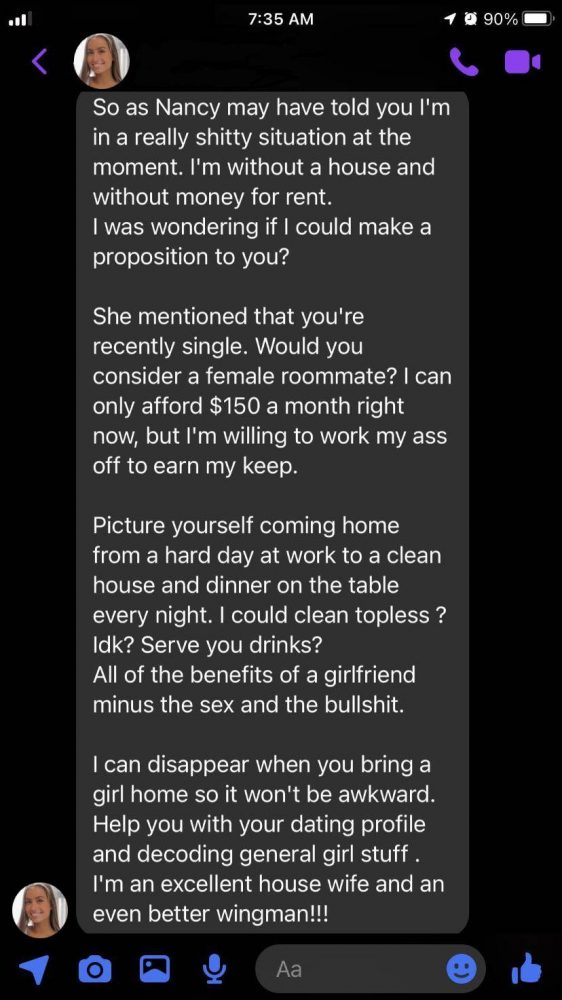 So, of course, we need to make a hypothetical out of this scenario. Here is a hypothetical situation: you are a single, twenty-year-old man and get an offer from a pretty girl. She says she needs a place to stay and does not have much money. She says she would pay some rent but plans to make up for what she doesn’t pay by doing favors around the house. These favors include cleaning the house and making food. And even better, she offers to do the chores topless.
